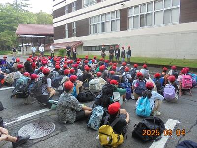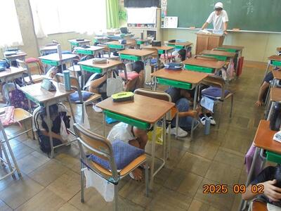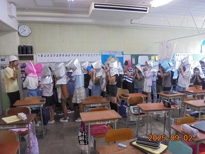今日は、机の下で頭部を守った後、避難するために教室内で整列するところまでを