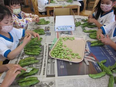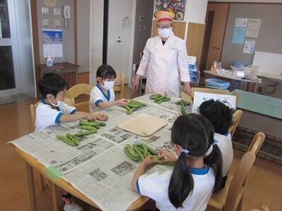 1年生がそら豆の皮をむきました。「そら豆くんのベッドだ!」