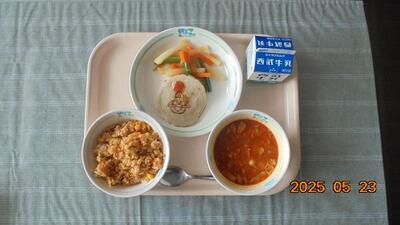5月23日の給食は、メキシカンピラフ、牛乳、ボロニアソーセージ、カリポリサラダ、ファイバーミネストローネでした。ソーセージには、みなみんの焼き印が入った「当たり」が各クラスに4つ?当たった人、ラッキーだったね!