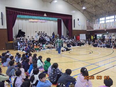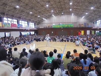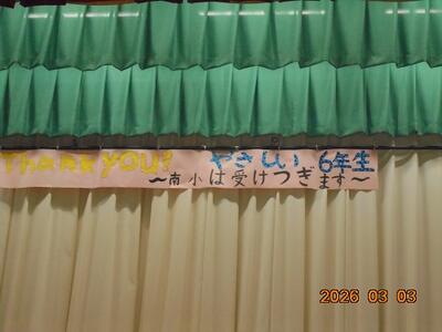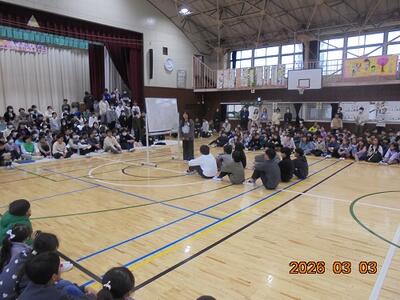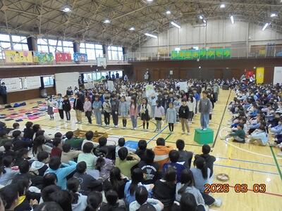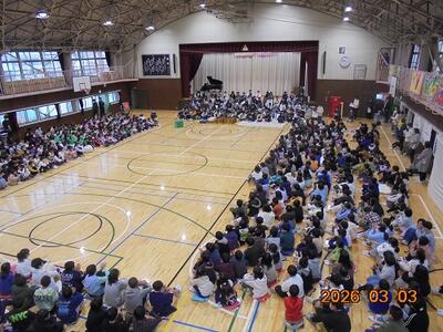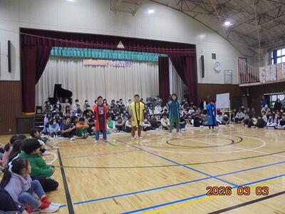 6年生を送る会 投稿: 教頭 (11:33) 3月3日、6年生を送る会が行われました。 1年生から5年生の出し物(演技)には、 6年生への感謝の気持ちがこめられていました。 ”6年生のために、いっしょうけんめいれんしゅうしたんだろうなあ” ということがよくわかる演技でした。 6年生うれしかったね。 今日はいい思い出ができたと思います。 残り約2週間、がんばりましょう。