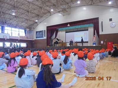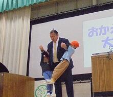 全校児童を前に、インタビュー、1年生とのふれあい、6年生との腕相撲など、